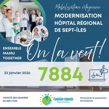 C’est avec beaucoup d’enthousiasme que la campagne de mobilisation en appui au projet d’agrandissement et de modernisation de l’Hôpital de Sept-Îles a été lancée le 8 décembre dernier. Depuis, 7884 personnes ont signé la pétition, signifiant clairement au gouvernement du Québec qu’il est grand temps de passer de la parole aux actes!